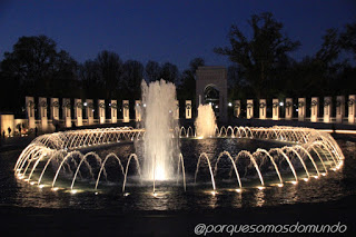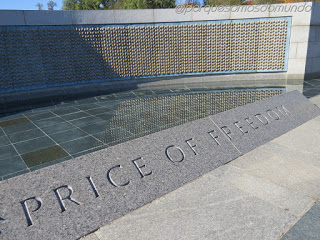 Primeiro, o World War II Memorial, erguido em homenagem aos que serviram na Segunda Guerra Mundial, incluindo civis e militares. Tem uma piscina central, com um chafariz, cercada por pilares que simbolizam os 48 Estados norte-americanos, o Distrito de Colúmbia, o território do Alasca e as comunidades de Porto Rico, Filipinas, Guam, Samoa americana e Ilhas Virgens. Ao lado, a Freedom Wall, com a inscrição “Here we mark the price of freedom”, tem 4048 estrelas de ouro que representam os americanos que morreram durante a guerra.