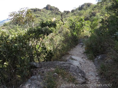 A trilha é de pedras, de leve a moderada, porque tem um trecho de subida íngreme, creio que entre a sexta e sétima cachoeiras. Pede calçados adequados (bota, tênis de caminhada) e uso de protetor solar.